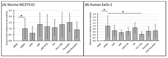 The cell viability of murine MC3T3-E1 and human SaOs-2 osteoblasts in the presence of various coagulation factors. (A) Murine MC3T3-E1 osteoblasts and (B) human SaOs-2 osteoblasts were incubated for three weeks in αMEM medium supplemented with ascorbic acid (1 mM), ß-glycerophosphate (8 mM), and calcium chloride (5 mM), referred to as osteoblast differentiation medium (ODM+). The negative control (ODM−) lacked these supplements. Cells were exposed to various coagulation factors (FVIII, vWF, vWF-FVIII, FIX, FX, thrombin, and FVIII-thrombin; 1 U/mL each). Cell viability was assessed relative to the ODM+ reference, set as 1. Data represent the means ± standard deviation of four independent assays performed in triplicate (n = 3), except for ODM+ reference and the negative control (ODM−) (n = 6). * indicates a significant difference (p < 0.05).