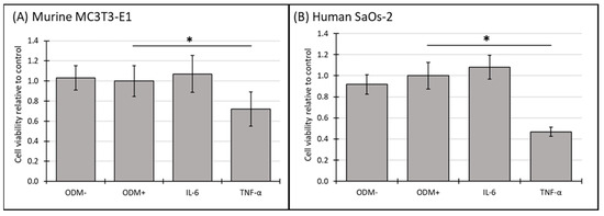 The cell viability of murine MC3T3-E1 and human SaOs-2 osteoblasts in the presence of different cytokines. (A) Murine MC3T3-E1 osteoblasts and (B) human SaOs-2 osteoblasts were incubated for three weeks in αMEM medium supplemented with ascorbic acid (1 mM), ß-glycerophosphate (8 mM), and calcium chloride (5 mM), referred to as osteoblast differentiation medium (ODM+). The negative control (ODM−) lacked these supplements. Cells were exposed to different cytokines (IL-6 and TNF-α; 50 ng/mL each). Cell viability was assessed relative to the ODM+ reference, which was set as 1. Data represent the means ± standard deviation of four independent assays performed in triplicate (n = 3), except for ODM+ reference and the negative control (ODM−) (n = 6). * indicates a significant difference (p < 0.05).