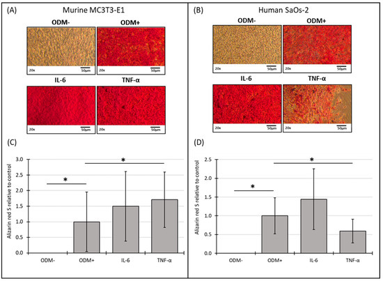 Representative images and photometric quantification of Alizarin red S staining in murine MC3T3-E1 and human SaOs-2 osteoblasts. Representative images of (A) murine MC3T3-E1 osteoblasts and (B) human SaOs-2 osteoblasts after three weeks of incubation in αMEM medium supplemented with ascorbic acid (1 mM), β-glycerophosphate (8 mM), and calcium chloride (5 mM), referred to as osteoblast differentiation medium (ODM+). The negative control (ODM−) lacked these supplements. Cells were exposed to different cytokines (IL-6 and TNF-α; 50 ng/mL each). After incubation, cells were stained with Alizarin red S to assess mineralization, which was then quantified photometrically. Quantification results are shown for (C) murine and (D) human osteoblasts, with data normalized to the ODM+ reference. Data are presented as the means ± standard deviation of four independent assays performed in triplicate (n = 3), except for the ODM+ reference and the negative control (ODM−) (n = 6). * indicates a significant difference (p < 0.05). Images were captured using transmitted light microscopy at 20× magnification. Scale bar: 50 µm.