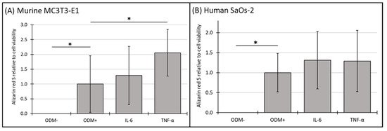 The expression of Alizarin red S relative to cell viability in murine MC3T3-E1 and human SaOs-2 osteoblasts. (A) Murine MC3T3-E1 osteoblasts and (B) human SaOs-2 osteoblasts were incubated for three weeks in αMEM medium supplemented with ascorbic acid (1 mM), ß-glycerophosphate (8 mM), and calcium chloride (5 mM), referred to as osteoblast differentiation medium (ODM+). The negative control (ODM−) lacked these supplements. Cells were exposed to different cytokines (IL-6 and TNF-α; 50 ng/mL each). The levels of Alizarin red S were quantified relative to the cell viability and are expressed relative to the ODM+ reference, which was set as 1. Values represent the means ± standard deviation of four independent assays performed in triplicate (n = 3), except for ODM+ reference and the negative control (ODM−) (n = 6). * indicates a significant difference (p < 0.05).