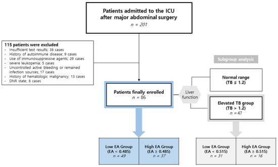 During November 2021 and September 2022, patients admitted to the surgical ICU of our institution following major abdominal surgery were eligible for study enrollment. The inclusion criteria were as follows: (1) Those who underwent major abdominal surgery under general anesthesia, irrespective of the type—laparoscopic, open, or robotic. ‘Major abdominal surgery’ is defined as an intra-peritoneal operation involving either luminal resection and/or solid organ resection associated with the gastrointestinal tract []. Both elective and emergency surgeries were included. (2) Those aged over 18 years. (3) Those capable of providing written consent. Exclusion criteria included: (1) patients with insufficient or missing test results for inflammatory markers, including EA, C-reactive protein (CRP), procalcitonin, and white blood cell (WBC) counts; (2) patients with a history of autoimmune disease or immunodeficiency; (3) patients prescribed immunosuppressive agents within the last 6 months; (4) patients with severe leukopenia (WBC count < 500 μL/L); (5) patients with uncontrolled active bleeding or unresolved sources of infection post-surgery; (6) patients with hematologic malignancy; or (7) pregnant patients. Patients were also excluded if they had agreed to a “do not resuscitate” order or refused any active resuscitation treatment. Subsequently, the enrolled participants were categorized into a low postoperative EA group (low EA group) and a high postoperative EA group (high EA group) based on EA cutoff values for postoperative complications. Additionally, participants were subgrouped based on their liver function assessed at ICU admission post-surgery. Regarding the pathophysiology of endotoxin, it enters the portal venous blood and is typically detoxified by Kuffer cells or excreted in bile in the liver [,,]. In patients with impaired liver function, the detoxification process is disrupted, resulting in elevated endotoxin levels. Patients undergoing major abdominal surgery are susceptible to postoperative hepatic dysfunction primarily because of blood loss, tissue damage, or hypoperfusion during the surgical procedure [,]. Therefore, a detailed analysis of endotoxin trends and distinct predictive values of endotoxin levels in subgroups based on liver function would be clinically valuable. Liver function was assessed using total bilirubin (TB) levels measured from participants’ blood samples upon admission to the ICU postoperatively, and we subgrouped those with abnormal liver function defined as TB > 1.2 mg/dL. This study received approval and was monitored by our Institutional Review Board (IRB No. KC21TISI0611), and it was conducted in accordance with the Declaration of Helsinki and its subsequent amendments.