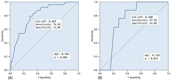 As shown in Figure 2A, the cutoff value for EA level associated with postoperative complications was 0.485, with an area under the curve (AUC) of 0.799 {Sensitivity (Se) = 79.2%, Specificity (Sp) = 71.0%, p < 0.001}. Based on this EA cutoff, participants were divided into two groups: 49 in the low EA group (57%, EA levels < 0.485) and 37 in the high EA group (43%, EA levels ≥ 0.485).