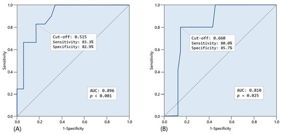 ROC curve analysis to determine cutoff value of endotoxin activity (EA) for clinical outcomes in elevated total bilirubin (TB) group participants (A) for occurrence of postoperative complication and (B) for 28-day mortality after surgery.