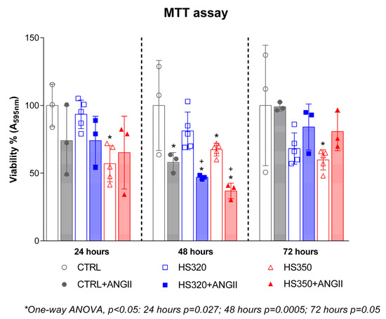 Changes in cellular metabolic activity (i.e., an indicator of cell viability) of HAECs following incubation with different NaCl concentrations before and after the addition of AngII in the cell media are shown in Figure 1. Cell metabolic activity was significantly reduced after 24, 48, and 72 h at 350 mOsmol/kg NaCl concentration compared to the CTRL. The addition of AngII to the HS320 incubated cells did not alter cell metabolic activity at 24 and 72 h time points, except for 48 h, where AngII significantly decreased metabolic activity compared to the CTRL and HS320 conditions. The addition of AngII to the HS350 incubated cells resulted in preserved metabolic activity of cells after 24 and 72 h, while it significantly decreased metabolic activity after 48 h of incubation.