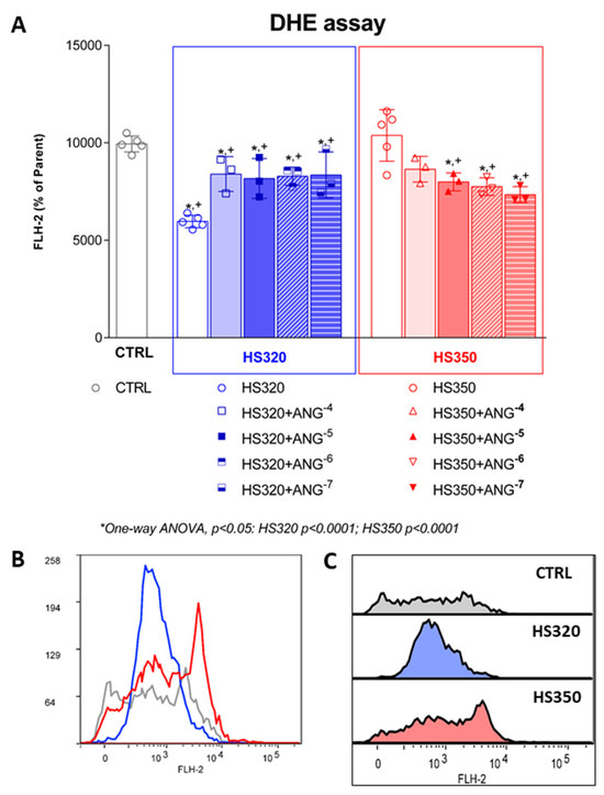 Formation of superoxide in HAECs following high-salt treatment accompanied by AngII exposure (A). Representative histogram overlay (B) and stacked histograms (C). Grey color representing CTRL group, blue color representing HS320 group, red color representing HS350 group. Results are expressed as geometric mean fluorescence intensity (GMFI). DHE—dihydroethidium; CTRL—control; HS—high salt; One-way ANOVA; *,+ significance level p < 0.05 (* compared to HS group before AngII; + compared to control group).