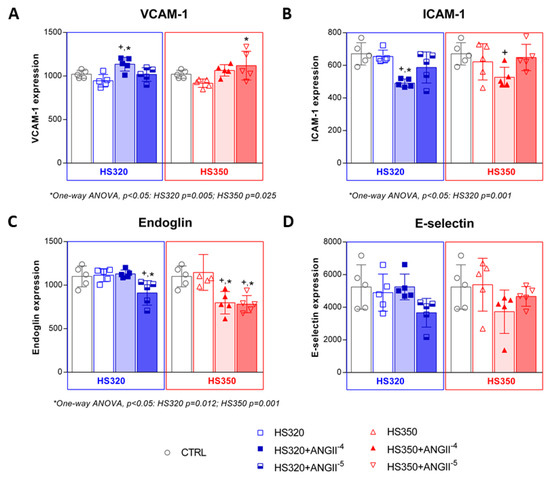 Changes in CAMs’ expression: VCAM-1 (A), ICAM-1 (B), Endoglin (C), and E-selectin (D) in HAECs following high-salt treatment accompanied by AngII exposure. Grey color representing CTRL group, blue color representing HS320 group, red color represent-ing HS350 group. Results are expressed as geometric mean fluorescence intensity (GMFI). CAMs—cell adhesion molecules; HAECs—human aortic endothelial cells; VCAM-1—vascular cell adhesion molecule 1; ICAM-1—intracellular adhesion molecule 1; HS—high salt; CTRL—control; AngII—angiotensin II; One-way ANOVA; *,+ significance level p < 0.05 (* compared to HS group before AngII; + compared to control group).