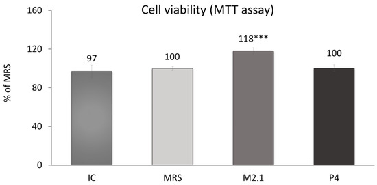 Assessment of cell viability in mature 3T3-L1 cells, treated with 10% cell-free supernatants (CFSs) from L. paracasei M2.1 or P4 strains, using the MTT assay: Abbreviations. IC—mature, untreated adipocytes; MRS—mature adipocytes treated with 10% (v/v) MRS broth (control); M2.1 and P4—experimental groups of mature adipocytes exposed to 10% (v/v) M2.1 or P4 CFSs. The statistical significance of differences between each experimental group (M2.1 or P4) and the control (MRS) group was evaluated using the non-parametric Mann–Whitney U test. The “asterisk” symbol shows the degree of significance in the figure as follows: *** for p < 0.001.