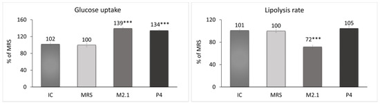 Assessment of the glucose uptake and lipolysis rate after 24 h of treatment of mature 3T3-L1 adipocytes with 10% cell-free supernatants (CFSs) from L. paracasei M2.1 or P4 strains. Abbreviations: IC—mature, untreated adipocytes; MRS—mature adipocytes treated with 10% (v/v) MRS broth (control); M2.1 and P4—experimental groups of mature adipocytes exposed to 10% (v/v) M2.1 or P4 CFSs. The statistical significance of differences between each experimental group (M2.1 or P4) and the control (MRS) group was evaluated using the non-parametric Mann–Whitney U test. The asterisk symbol shows the degree of significance in the figures as follows: *** for p < 0.001.