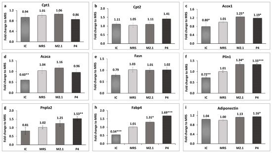 The effect of L. paracasei M2.1 and P4 cell-free supernatants (CFSs) on the relative fold change in the gene expression of (a) carnitine palmitoyltransferase 1a (Cpt1); (b) carnitine palmitoyltransferase 2 (Cpt2); (c) acyl-coenzyme A oxidase 1, palmitoyl (Acox1); (d) acetyl-CoA carboxylase (Acaca); (e) fatty acid synthase (Fasn); (f) perilipin 1 (Plin1); (g) patatin-like phospholipase domain containing 2 (Pnpla2); (h) fatty acid-binding protein 4 (Fabp4); and (i) adiponectin. Abbreviations: IC—mature, untreated adipocytes; MRS—mature adipocytes treated with 10% (v/v) MRS broth (control); M2.1 and P4—experimental groups of mature adipocytes exposed to 10% (v/v) M2.1 or P4 cell-free supernatants (CFSs). The statistical significance of differences between each experimental group (M2.1 or P4) and the control (MRS) group was evaluated using the non-parametric Mann–Whitney U test. The “asterisk” symbol shows the degree of significance in the figures as follows: * for p < 0.05, ** for p < 0.01, and *** for p < 0.001.