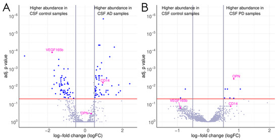Differentially expressed proteins in cerebrospinal fluid (CSF) samples from patients with Alzheimer’s disease (A) and Parkinson’s disease (B) in comparison to healthy controls identified using the scioDiscover proteomic screening array. The red line indicates the significance cut-off of an adjusted p value < 0.05.