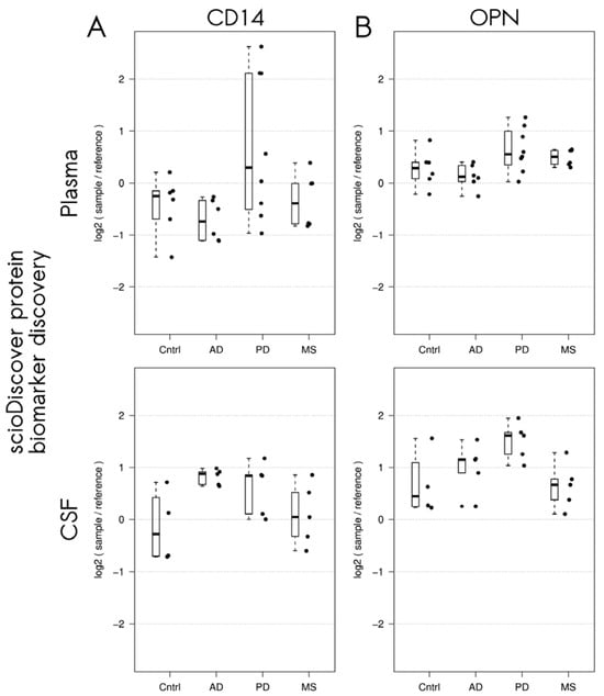 Abundances of cluster of differentiation 14 (CD14) (A) and osteopontin (OPN) (B) identified using the scioDiscover platform in controls (Cntrl) and patients with Alzheimer’s disease (AD), Parkinson’s disease (PD), and multiple sclerosis (MS). Protein abundance was measured by the log-ratio of signals of individual samples and a reference sample.