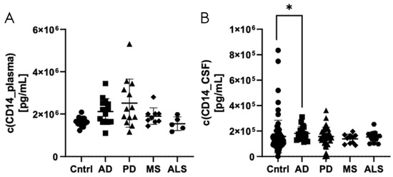 CD14 levels in plasma (A) and CSF (B) of patients with Alzheimer’s disease, Parkinson’s disease, multiple sclerosis, and amyotrophic lateral sclerosis and from healthy controls measured with the automated fluorescence-based Simple Plex™ Human CD14 assay. * p < 0.05. AD: Alzheimer’s disease; ALS: amyotrophic lateral sclerosis; CSF: cerebrospinal fluid; CD14: cluster of differentiation 14; Cntrl: controls; MS: multiple sclerosis; PD: Parkinson’s disease.