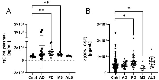 Osteopontin levels in plasma (A) and CSF (B) samples from patients with Alzheimer’s disease, Parkinson’s disease, multiple sclerosis, and amyotrophic lateral sclerosis and from healthy controls determined using the automated fluorescence-based Simple Plex™ Human OPN assay. * corresponds to p < 0.05 and ** to p < 0.01. AD: Alzheimer’s disease; ALS: amyotrophic lateral sclerosis; CSF: cerebrospinal fluid; Cntrl: controls; MS: multiple sclerosis; OPN: osteopontin; PD: Parkinson’s disease.