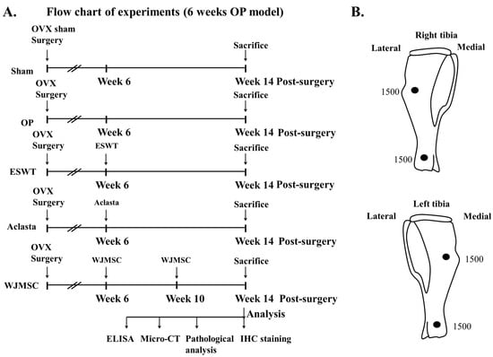 The study design and application of ESWT. (A) Flowchart displaying the experiments and timing for knee surgery, shockwave application, Aclasta treatment, WJMSC treatments, and sacrifice of the animals. Eight rats were used for each group. (B) Focused ESWT application (0.25 mJ/mm2, 4 Hz, 1500 impulses for each location) on right and left tibia at 0.5 cm below the skin of rats at each location, indicated as black circles. OP group = osteoporosis, OVX = ovariectomy, ESWT group = extracorporeal shockwave therapy, WJMSC group = Wharton Jelly-derived mesenchymal stem cell treatment, micro-CT = micro computed tomography, IHC = immunohistochemistry, ELISA = enzyme-linked immunosorbent assay.