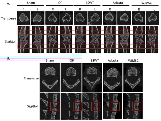 In the experiment, micro-CT images were used to visualize the bone structures (lower limbs and spine) of Sham, OP, ESWT, Aclasta, and WJMSC groups (Figure 2). The images of the OP group showed that OVX rats had induced a loss of cancellous bone from the transverse and sagittal views of micro-CT as compared with the Sham group at 6 weeks. After treatments, ESWT, Aclasta, and WJMSC induced bone regeneration in both femurs, tibias, and vertebral bone (Figure 2A,B; red rectangle line, region of interest, ROI). The image results show that ESWT, Aclasta, and WJMSC improved bone regeneration and Aclasta was better than ESWT and WJMSC.