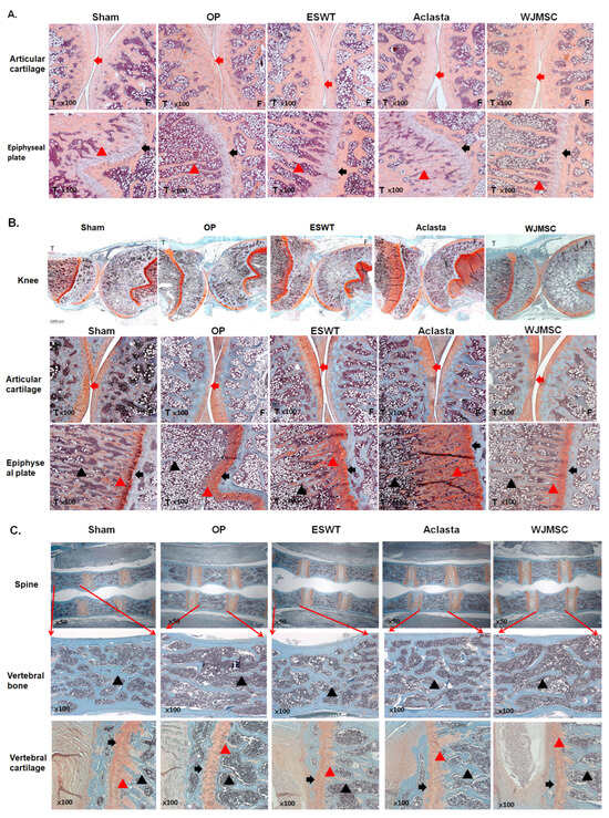 ESWT, Aclasta (zoledronic acid), and WJMSC treatments were compared the chondroprotective effects on the articular cartilage of the knees in OVX rats. The pathological changes of hyaline cartilage were revealed by H&E stain and safranin-O stain in Sham, OP, ESWT, Aclasta, and WJMSC groups (Figure 3). After treatment, the hyaline cartilages were improved in ESWT, Aclasta, and WJMSC groups as compared with Sham and OP groups (Figure 3B, arrow head). In addition, the epiphyseal plate (black arrow) and region of primary spongiosa (red triangle) became thin and lost the cancellous bone (black triangle) nearby in the OP group (Figure 3B). The epiphyseal plate and cancellous bone were regenerated in ESWT, Aclasta, and WJMSC groups as compared with the OP and Sham groups (Figure 3 and Table 2). The primary spongiosa of the Aclasta group was thicker than in the Sham, ESWT, and WJMSC groups (Figure 3B, red triangle). Furthermore, in the spine of the OP group, there was a loss of vertebral cartilage (arrowhead) and cancellous bone (black triangle). However, following treatments with ESWT, Aclasta, and WJMSC, all of these strictures improved (Figure 3C). Based on our findings, it appears that treatments with ESWT, Aclasta, and WJMSC had a protective effect on various structures including the articular cartilage, cancellous bone, epiphyseal plate, vertebral cartilage, and bone in OVX rats.