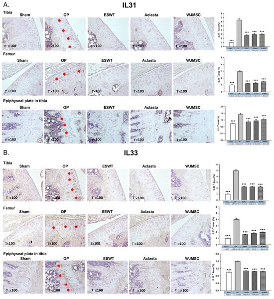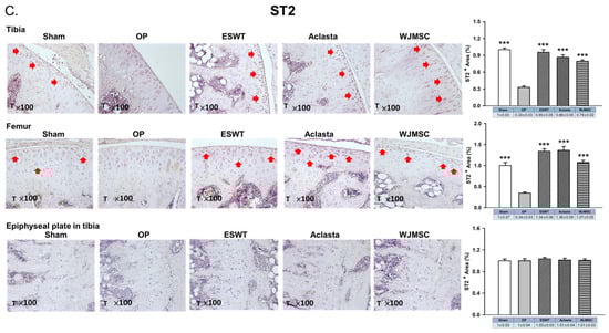 The cytokines IL31 and IL33 are reported to play a role in bone remodeling and osteoporosis. We showed the expression of IL31, IL33, and IL33 receptor ST2 in the articular cartilage and epiphyseal plate of the left tibia after treatments in OVX rats. The expression of IL31 and IL33 was induced in the articular cartilage and hypertrophic cartilage of the epiphyseal plate in the OP group (red arrow) and reduced in ESWT, Aclasta, and WJMSC groups (*** p < 0.001) (Figure 4A,B). There were no significant differences in the expression of IL31 and IL33 among the ESWT, Aclasta, and WJMSC groups. The expression of ST2 in the articular cartilage of the left femur and tibia showed contrasting patterns compared to IL31 and IL33. In the OP group, ST2 expression was reduced, whereas it was significantly induced in ESWT, Aclasta, and WJMSC groups (*** p < 0.001) (Figure 4C). The expression of ST2 did not show any significant differences among the ESWT, Aclasta, and WJMSC treatment groups.
