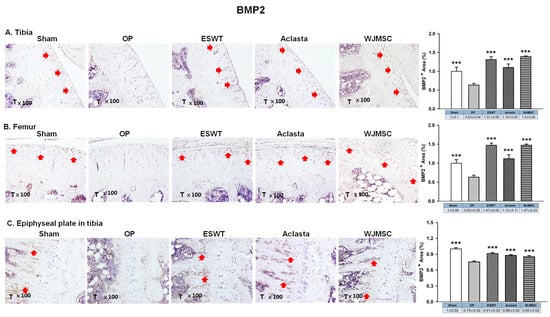In the analysis of the left knee, we observed that the expression of BMP2 was reduced in the OP group and was significantly induced to the same level of Sham group following treatments in the articular cartilage of the left tibia and femur (*** p < 0.001) (Figure 5). In the epiphyseal plate, the expression of BMP2 was obviously increased in the region of the primary spongiosa of metaphysis in the ESWT, Aclasta, and WJMSC groups to stimulate endochondral bone formation in OVX rats. The results may suggest that ESWT, Aclasta, and WJMSC maintained the level of BMP2 in articular cartilage to protect the extracellular matrix proteins and stimulated the expression in the primary spongiosa of metaphysis to promote the regeneration of endochondral bone and cancellous bone in OVX rats.