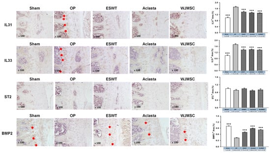 The expression of IL31 and IL33 was significantly increased in the deep zone of vertebral cartilage in OVX rats, but was decreased in ESWT, Aclasta, and WJMSC groups (*** p < 0.001) (Figure 6). However, there was no notable difference in the level of ST2, the receptor for IL33, among all groups. Additionally, BMP2 expression was decreased in the deep zone of vertebral cartilage in OVX rats, but significantly increased in the ESWT, Aclasta, and WJMSC groups to promote endochondral bone formation (*** p < 0.001). These findings indicated that while ESWT, Aclasta, and WJMSC groups all led to the inhibition of IL31 and IL33 expression and the enhancement of BMP2 expression, no significant differences were observed between the treatment modalities.