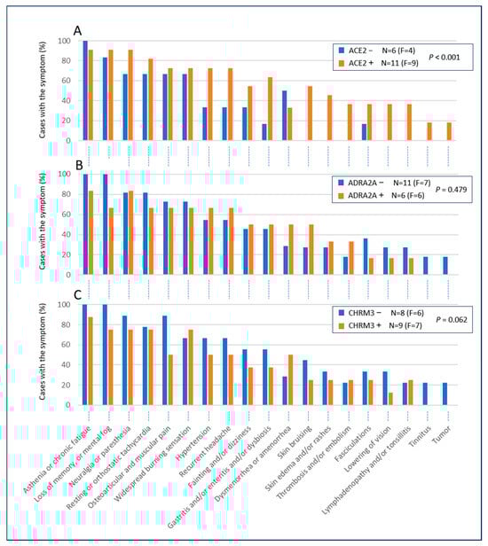Presence or absence of symptoms in patients negative or positive for anti-ACE2 (panel A), anti-ADRA2A (panel B) and anti-CHRM3 (panel C) antibodies. F is the number of female patients who are negative or positive for the indicated antibodies.