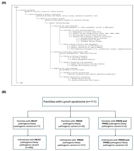 A comprehensive description of our LS registry and patient recruitment. (A) The flowchart outlines a step-by-step structured process for managing and categorizing individuals suspected or confirmed to have LS. It begins with the “Initial Screening” based on clinical criteria or family history (Bethesda and Amsterdam criteria I/II for LS), followed by Risk Assessment & Genetic Counselling. Individuals meeting eligibility criteria are referred for Genetic Testing, leading to three distinct outcomes: Positive for LS, Variants of Uncertain Significance (VUS), or Negative for LS. Each outcome has specific downstream pathways for inclusion in the LS registry, follow-up testing, or standard clinical surveillance, respectively. The flowchart also details strategies for Family Cascade Testing, comprehensive management, and research integration. (B) A flow diagram showing the number of families and individuals who were genetically diagnosed with LS in our registry, categorized by the specific MMR gene with germline P/LPVs. Note: While families and individuals with MSH6 and PMS2 P/LPVs are shown here for completeness, they were excluded from further analyses due to small number of cases.
