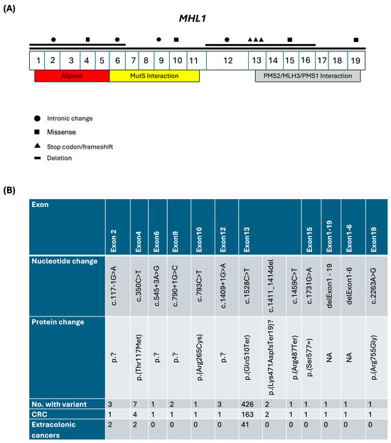 Distribution and clinical characteristics of P/LPVs in the MLH1 gene. (A) The exon-intron structure of the MLH1 gene, highlighting functional domains: ATPase domain (exons 1–5, red), MutS interaction domain (exons 6–11, yellow), and PMS2/MLH3/PMS1 interaction domain (exons 13–19, gray). Symbols represent different types of variants: intronic changes (●), missense mutations (■), stop codon/frameshift mutations (▲), and deletions (—). (B) A description table provides a detailed summary of nucleotide and protein changes for each P/LPV, their corresponding exons, and the number of individuals carrying these PLPVs. Exon 13 shows the highest variant frequency, with 426 LSVH with the PV c.1528C>T (p.Gln510Ter). The associated cancer phenotypes indicate a predominance of CRC among LSVH, while extracolonic cancer incidence remains low.