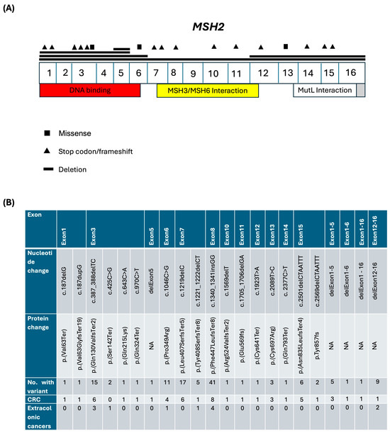 Distribution and clinical characteristics of P/LPVs in the MSH2 gene. (A) A panel displays the exon–intron structure of the MSH2 gene, illustrating its functional domains: DNA binding domain (exons 1–6, red), MSH3/MSH6 interaction domain (exons 7–12, yellow), and MutL interaction domain (exons 13–16, gray). Different variant types are represented by specific symbols: missense mutations (■), stop codon/frameshift mutations (▲), and deletions (—). (B). A table details the nucleotide and protein changes for each PV, the specific exons affected, and the number of LSVH. Exon 7 shows the highest variant frequency, with 17 LSVH with the PV c.1219delC (p.Leu407SerfsTer5). The associated cancer phenotypes indicate a predominance of CRC among LSVH, while extracolonic cancer incidence remains low.