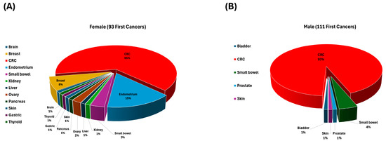 Pie charts showing the distribution of first cancers in LSVH according to sex. (A) The spectrum of first cancers in female LSVH (n = 93), where CRC was the predominant first cancer type, accounting for 65% of all first cancers. (B) The distribution in male LSVH (n = 111) with a dominance of CRC (93%) as the first cancer diagnosed, with limited occurrence of other cancers.