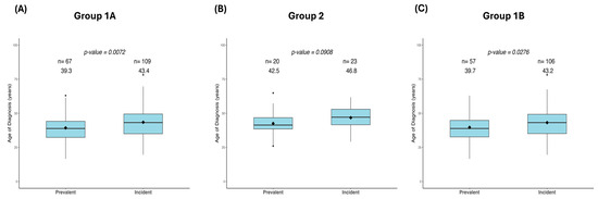 Box plots and whiskers showing age at CRC diagnosis in prevalent and incident cases stratified by mutated gene status. (A) In Group 1A, the prevalent cases were diagnosed with cancer at a significantly younger age compared to the incident cases. (B) In Group 2, there was no significant difference in the age at cancer diagnosis between the prevalent and incident cases. (C) In Group 1B, the prevalent cases were diagnosed with cancer significantly at a younger age compared to incident cases.
