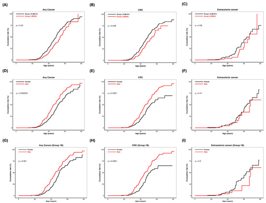 Cumulative risk of LS-associated cancers by gene and sex. (A–C) The cumulative risk curves comparing MLH1 (black) and MSH2 (red) LSVH. (D–F) Cumulative risk of LS-associated cancers by sex (male = red, female = black). (G–I) Results in Group 1B, showing similar sex-specific trends.