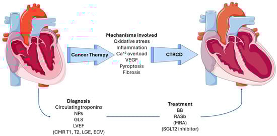 Overview of pathophysiologic mechanisms, diagnosis, and treatment of CTRCD. Content in parenthesis represents potential approaches that have not been incorporated into guidelines. VEGF: vascular endothelial growth factor, NP: natriuretic peptide, GLS: global longitudinal strain, LVEF: left ventricular ejection fraction, CMR: cardiac magnetic resonance, LGE: late gadolinium enhancement, ECV: extracellular volume, BB: beta blocker, RASb: renin-angiotensin system blocker, MRA: mineralocorticoid receptor antagonist, and SGLT2: sodium-glucose cotransporter-2.