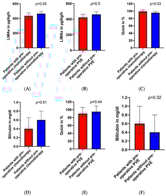 (A) Preoperative LiMAx values in patients with and without preoperative chemotherapy (p > 0.05). (B) Preoperative LiMAx values in patients with and without preoperative PVE (p > 0.05). (C) Preoperative Quick values in patients with and without preoperative chemotherapy (p > 0.05). (D) Preoperative bilirubin levels in patients with and without preoperative chemotherapy (p > 0.05). (E) Preoperative Quick values in patients with and without preoperative PVE (p > 0.05). (F) Preoperative bilirubin levels in patients with and without preoperative PVE (p > 0.05).