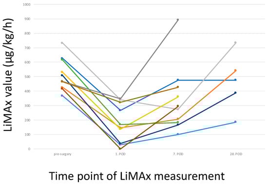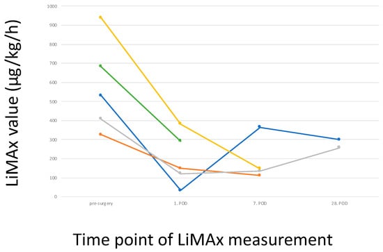 Patient 18 with a preoperative LiMAx (157 µg/kg/h), who was encouraged to consider therapeutic options as an alternative to surgery, showed an increase at the second measurement at POD 1 (224 µg/kg/h). Unfortunately, the patient refused further analyses (therefore not shown in Figure 3).