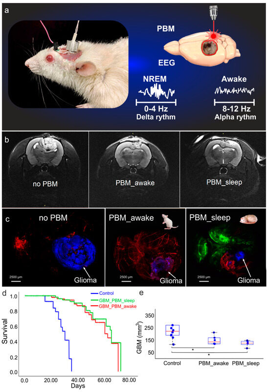 The effects of PBM on survival and progression of rats’ glioma: (a) schematic illustration of PBM under EEG control during sleep or awake states; (b) representative images of ex vivo confocal analysis of glioma size in rats without and after the PBM course during wakefulness or sleep, respectively; (c) representative MRI images of rat glioma 4–week growth without and after the PBM course during wakefulness or sleep; (d) Kaplan–Meier overall survival plots between the tested groups; the survival differences between rats with glioma, without, and after the course of PBM during sleep or wakefulness was significant (X2 test, p = 0.00000000000129 between the no PBM and the PBM_sleep groups and p = 0.00000000000024 between the no PBM and the PBM_awake groups; n = 20 in each group); (e) MRI analysis of glioma size in rats without and after the course of PBM during sleep or wakefulness; n = 10 in each group; *—p < 0.05 between groups, the ANOVA test with post hoc Duncan test.