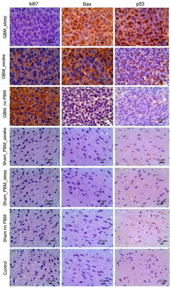 IHC analysis of proliferation and apoptosis of glioma cells in seven tested groups, including control (healthy rats) group; 3 sham groups, in which animals received an injection of saline in the same volume and location as the glioma cells were implanted without PBM and after the PBM course during sleep and awake states; 3 glioma groups, in which rats were with glioma without PBM and after the PBM course during sleep and awake states. The quantitative analysis of immunopositive cells (shown in brown) expressing K67, Bax, and p53 is presented in Table 1.