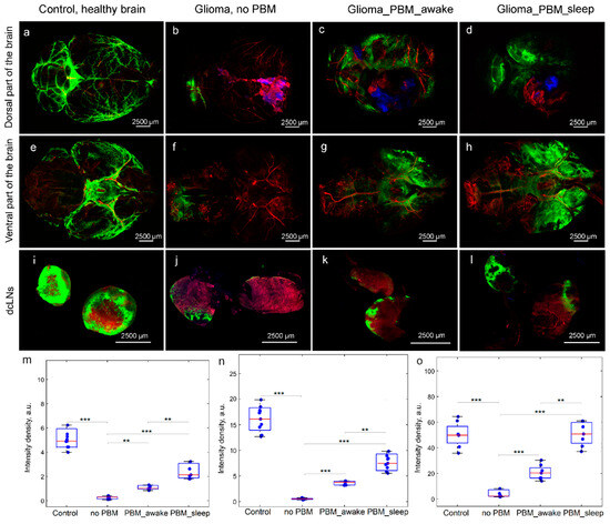 The effects of the PBM course during sleep or wakefulness on BD in the tested groups: (a–d) and (e–h) Representative images of FITCD spreading in dorsal (a–d) and ventral (e–h) parts of the brain from the control group (healthy brain) (a,e), the glioma group without the PBM course (b,f), and the groups treated by the PBM course during wakefulness (c,g) or sleep (d,h); (i–l) representative images of accumulation of FITCD in dcLNs in rats from the control group (i), the glioma group without the PBM course (j), and the groups treated by the PBM course during wakefulness (k) or sleep (l); (m–o) quantitative analysis of intensity of fluorescent signal from FITCD in dorsal (m) and ventral (n) parts of the brain and in dcLNs (o); n = 10 in each group; ***—p < 0.001; **—p < 0.01 between groups; the ANOVA test with post hoc Duncan test.