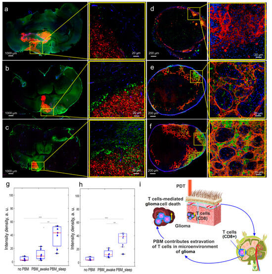 The effects of the PBM course during sleep or wakefulness on brain’s tumor immunity: (a–f) Representative images of fluorescent glioma (red) and CD8+ T cells (green) in the brain (a–c) and in dcLNs (d–f) in rats with glioma and without the PBM course (a,d), in rats with glioma receiving the PBM course during wakefulness (b,e), and in rats with glioma and receiving the PBM course during sleep (c,f); in (d–f): CD8+ T cells (green), LVs (red), and DAPI (blue); (g,h)—quantitative analysis of intensity of fluorescent signal from CD8+ T cells in glioma (g) and in dcLNs (h); n = 10 in each group, ***—p < 0.001; **—p < 0.01 between groups; the ANOVA test with post hoc Duncan test; (i)—schematic illustration of the PBM effects on an immune response against the glioma growth via increasing the number of cytotoxic CD8+ cells in glioma cells and in dcLNs.
