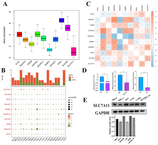 Pan-cancer gene expression profiles of disulfidoptosis-related genes. (A) Expression box diagram of DRG expression in pan cancer in TCGA. (B) Heatmap showing the expression of each DRG in different tumor and normal tissues. The size of the circles indicates statistical significance (FDR). The expression data consist of log2-transformed fold change (FC) values (log2FC). Color coding indicates the log2(FC) of induction (red) or repression (green). (C) Correlation heatmap between each DRG. (D) Results from qPCR validation. The relative mRNA expression of SLC7A11 in each tumor cell line is relative to GAPDH in normal cell lines. (* p < 0.05) (E) WB validation results. The protein expression of SLC7A11 in tumor cell lines and normal cell lines. DRG, disulfidoptosis-associated genes; FDR, false discovery rate; qPCR, quantitative polymerase chain reaction; and WB, Western blot. * p < 0.05; ** p < 0.01; and *** p < 0.001.