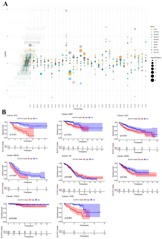 Prognostic value of disulfidoptosis-related genes in pan cancer. (A) Forest plot of the survival analysis for the disulfidoptosis-related gene in pan cancer. (B) Kaplan–Meier (KM) survival curve of SLC7A11 in ACC, KIRP, LIHC, MESO, OV, SARC, THCA, and UVM.