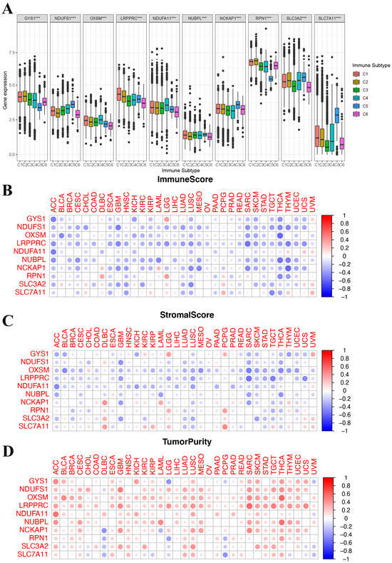 Correlation of disulfidoptosis-related gene expression with the tumor immune microenvironment. (A) The relationship between disulfidoptosis-related gene expression and pan-cancer immune subtypes. (B–D) Heatmap displaying correlations between disulfidoptosis-related gene expression and immune, stromal, and tumor purity scores (from ESTIMATE). Red: high level of immune cell infiltration; blue: low level of immune cell infiltration; the size of the circles indicates statistical significance. *** p < 0.001.