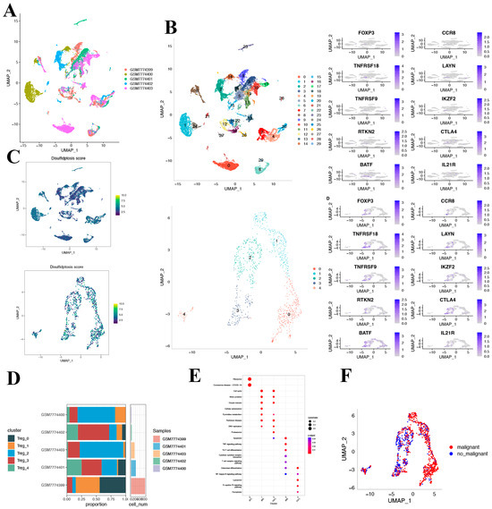 After log-normalization and dimensionality reduction, 30 clusters were identified (Figure 5A). Recognizing the pivotal role that Treg cells play in the immune microenvironment and immunotherapy of HCC, we selected 8 Treg cell marker genes: FOXP3, CCR8, TNFRSF8, LAYN, TNFRSF9, IKZF2, RTKN2, CTLA4, BATF, and IL21R [21]. Within the 30 clusters, these Treg cell marker genes were predominantly expressed in clusters 12, 16, 25, and 28. Using clusters that primarily expressed the eight Treg cell marker genes, further dimensionality reduction clustering analysis was performed (Figure 5B). In measuring disulfidoptosis activity across varied cell types, we employed the “AddModuleScore” function within the Seurat package. This enabled the assessment of expression levels associated with the ten-gene set integral to disulfidoptosis in every cell under study (Figure 5C). Figure 5D displays the UAMP plot representing the distribution of the five samples. Consequently, five distinct Treg cell clusters were identified and utilized for the subsequent analysis.