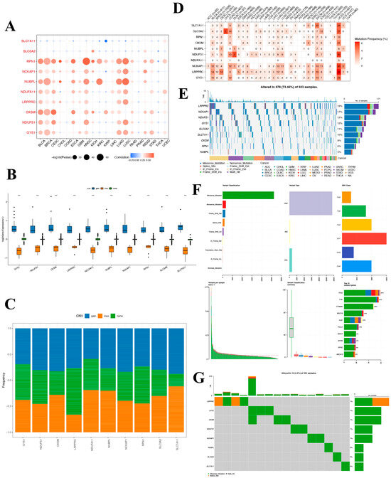 To delve into the potential roles of DRGs in tumorigenesis and to discern the underlying causes for their aberrant expression, we undertook an exhaustive pan-cancer analysis. Initially, we probed the CNV patterns of DRGs across 33 distinct cancers in the TCGA database. The heatmap reveals extensive CNV variation for these genes in BLCA, breast invasive carcinoma (BRCA), cervical squamous cell carcinoma and endocervical adenocarcinoma (CESC), head and neck squamous cell carcinoma (HNSC), LUAD, and lung squamous cell carcinoma (LUSC). Notably, RPN1, NUBPL, and OXSM demonstrate widespread CNV across various cancers. Conversely, the expression of SLC7A11 displays a weak negative correlation with CNV and exhibits no correlation with COAD, GBM, or rectum adenocarcinoma (READ) (Figure 6A). To further elucidate the relationship between CNV and gene expression, we classified the samples into CNV-gain and CNV-loss groups. And the result revealed that in the CNV-gain group, the expression levels of the DRGs were elevated compared to samples without CNV, while in the CNV-loss group, the expression levels of the DRGs were diminished compared to those without CNV (Figure 6B). CNV gene frequency analysis showed that NDUFS1, RPN1, NCKAP1, and LRPPRC had a high frequency of amplified copy numbers, whereas NDUFA11 showed a high proportion of reduced copy numbers (Figure 6C). These results indicate that the SLC7A11 gene is less likely to undergo copy number alterations.