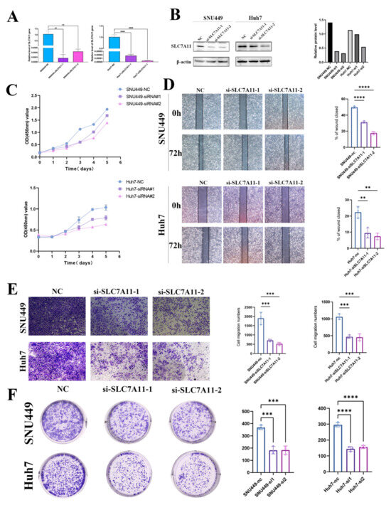 A pipette was used to scratch the cells after they had been merged into the six-well plate. After scratching, we took photos at 0 h and 76 h. SNU449 or Huh7 were starved in serum-free RPMI 1640 medium for 8 h in order to evaluate their migration capability. Next, 5 × 104 cells in 100 μL of serum-free RPMI 1640 medium were added to transwell inserts (Corning, NY, USA). As a nutritional attractant, serum-free RPMI 1640 medium with 10% FBS was used as a base for transwell assays. After 8 h, lower surface cells were fixed with 4% polyformaldehyde (Beyotime) for 30 min and stained with 0.4% crystal violet (Beyotime). The upper surface of the slide was wiped clean using a cotton swab, and the lower surface was counted under the microscope. Huh7 or SNU449 transfected with SLC7A11-siRNA were incubated in RPMI-1640 medium containing 10% FBS, maintained in RPMI-1640 medium containing 10% FBS, and incubated at 37 °C with 5% CO2. Within 24 h of transfection, we inoculated 1000 Huh7 or SNU449 cells into the six-well plates, which were then cultured in RPMI-1640 medium with 10% FBS for two weeks, and finally we counted and analyzed the colonies.