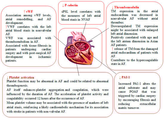 After cardiac surgery, AF is linked to a higher risk of illness and death, and vWF is regarded as an indicator of endothelial dysfunction or damage. Therefore, vWF levels could be a useful biomarker for predicting the occurrence of AF following cardiac surgery. Additionally, the question of whether there is a connection between vWF and tissue remodeling that could contribute to post-surgical AF has been investigated. It was found that, in patients who underwent cardiac surgery, elevated plasma vWF levels were associated with tissue fibrosis and the development of post-surgical AF in those with ischemia. The results indicate a correlation between vWF levels, atrial remodeling, and the onset of AF, as demonstrated by higher vWF expression in the right-atrial tissue of ischemic patients who developed post-surgical AF [].
