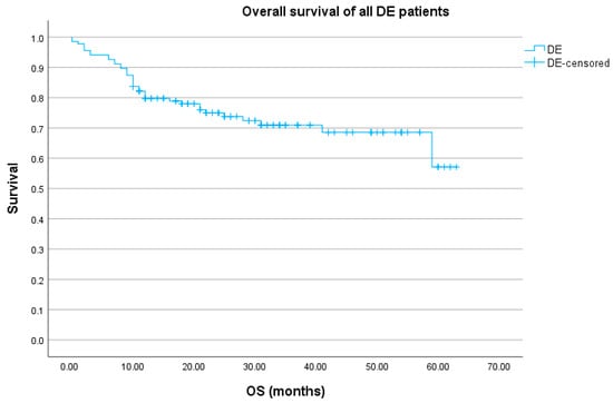 Standard treatment for DLBCL is R-CHOP (rituximab, cyclophosphamide, doxorubicin, vincristine, and prednisone) and, while current guidelines suggest intensified chemotherapy protocols for DHL and THL (mostly R-DA-EPOCH—dose-adjusted rituximab, etoposide, cyclophosphamide, doxorubicin, vincristine, and prednisone) [], the evidence to intensively treat DEL is weak, based on a small number of patients enrolled and the retrospective design of the studies [,]. DEL has worse progression-free survival (PFS) and OS independent of the international prognostic index (IPI) and cell-of-origin (COO) [] and is considered an adverse prognostic indicator in DLBCL []. Yet, some retrospective series report a favorable outcome for limited-stage patients treated with R-CHOP []. A German high-grade lymphoma study group performed a post hoc analysis of DLBCL patients, treated in prospective clinical trials, regarding their COO and expression of MYC, BCL2, and BCL6. Their analysis indicated that, in patients treated with R-CHOP, the double-expressor (DE) status was associated with significantly inferior survival compared to patients without DE status; however, this is only in the germinal center B-cell (GCB) COO subgroup []. As the IPI score has been confirmed as a useful prognostic tool for patients with DLBCL [], it has been more recently established, also, as an independent prognostic factor for DHL and DEL [].