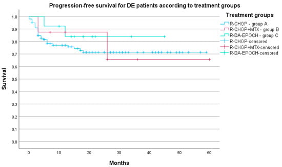 PFS of DE DLBCL patients (N = 122) according to three treatment groups (p = 0.674).
