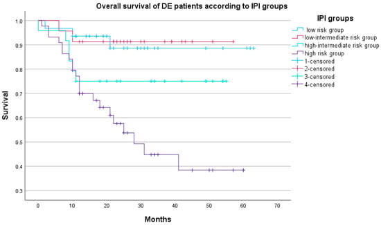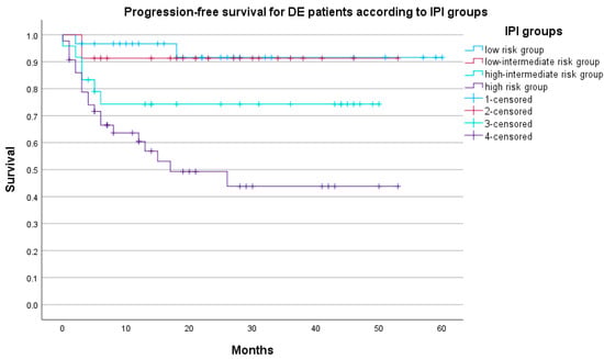 When comparing the survival of DEL patients among different IPI risk groups, there was a significantly higher risk of death in the high-risk IPI group (HR 7.68, 95% CI 2.32–25.49, p = 0.001) while the risk of death for other IPI risk groups was not statistically significantly different (low vs. high-intermediate group p = 0.993, low-intermediate vs. high-intermediate group p = 0.268). The OS according to the IPI risk groups is given in Figure 4. As for the PFS, a significant difference was found for the high-intermediate IPI risk group (HR 5.48, 95% CI 1.13–26.64, p = 0.035) and for the high-risk IPI group (HR 13.26, 95% CI 2.97–59.25, p = 0.001) while the risk of progression or death for the other two IPI risk groups was not statistically significantly different (low vs. high-intermediate group p = 0.604, low-intermediate vs. high-intermediate group p = 0.305). The PFS according to the IPI groups is presented in Figure 5.