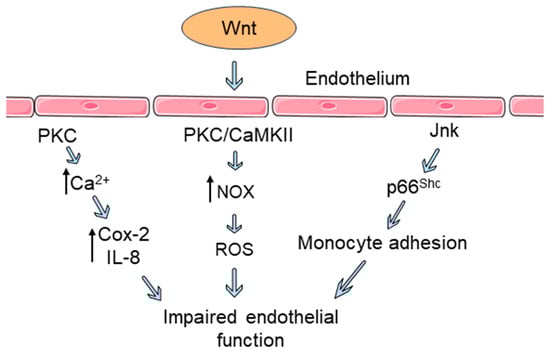 Wnt signaling in endothelial dysfunction. The Wnt pathway influences endothelial dysfunction through diverse mechanisms. Wnt ligand binding to endothelial cells triggers cyclooxygenase-2 (Cox-2) expression and the release of inflammatory cytokines via Ca2+/protein kinase C (PKC) signaling, which contributes to increased endothelial permeability. In endothelial cells, Wnt signaling triggers NADPH oxidase (NOX) activation, leading to the increased production of reactive oxygen species (ROS). Both PKC and calcium/calmodulin-dependent protein kinase II (CaMKII) interact with NOX and possibly regulate vascular oxidative stress. Binding of a Wnt ligand induces the phosphorylation and activation of redox regulatory protein p66Shc by Jnk in endothelial cells, which triggers monocyte adhesion to the endothelium. These processes contribute to increased endothelial permeability and impaired endothelial barrier function. Components were created using Servier Medical Art templates, which are licensed under a Creative Commons Attribution 3.0 Unported License; https://smart.servier.com (accessed on 27 December 2023).