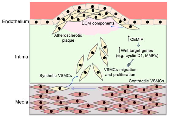 Wnt signaling regulates vascular smooth muscle cell (VSMC) proliferation and migration. VSMCs reside in the media within healthy arteries. In early atherosclerosis, the contractile phenotype of VSMCs changes to a synthetic phenotype and VSMCs migrate towards the intima. Synthetic VSMCs produce extracellular matrix (ECM) rich in proteoglycans and glycosaminoglycans, which retain more lipids in the vessel wall. Pharmacological and genetic inhibition of the Wnt pathway reduces VSMC proliferation. Overexpression of cell-migration-inducing and hyaluronan-binding protein (CEMIP) promotes VSMC proliferation and migration via activating the Wnt/β-catenin pathway and the upregulation of Wnt target genes including matrix metalloproteinases (MMPs), cyclin D1, and others.