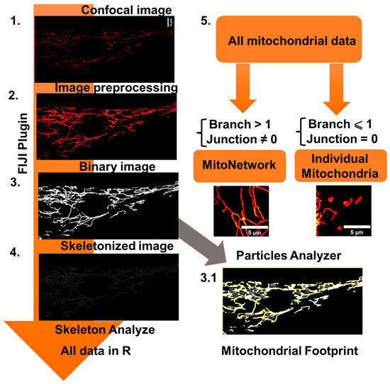 Mitochondrial network (MN) morphology analysis used in this work. (1.) Original confocal image was preprocessed (2.), which included background subtraction (rolling ball radius set on 50 pixels), median filter, and local contrast enhance (CLACHE) functions. (3.) Next, the image was binarized using threshold by the “Otsu” method. (3.1) Next, the image was copied, and the mitochondrial footprint was calculated by the sum of the mitochondrial areas in the “Particle analyzer” Fiji plugin. (4.) Furthermore, the image was skeletonized using the “Skeletonize” function and processed using the built-in “Skeleton Analysis” function. (5.) Next, the table of the received data was transmitted to the R programming environment. The data table was filtered using the “filter” function from “dplyr” package into two data subsets, “mitochondrial network” and “individual mitochondria”, according to the described scheme (mitochondrial networks were considered objects that consist of more than one branch and non-zero junction, whereas individual mitochondria consist of only one branch and zero junction).